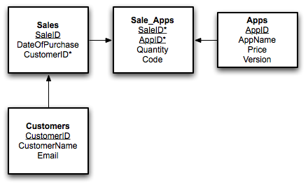 The second thing I would like to point out is that this is a good example of getting around many-to-many relationships. A Sale can have many Apps, yet an App can have many Sales. As such you need the Sale_Apps table to provide unique pairings for each combination. The simple way to get around a many to many situation is to put a 3rd table in the middle, put both primary keys in as a concatenated key and reverse the direction of the arrows (so that the “to many” goes to the new table).